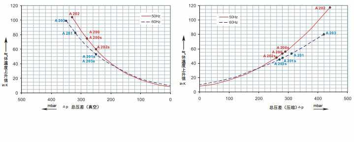 該型號(hào)高真空度為負(fù)320mbar,高正壓為420mbar,上圖中橫軸為壓力情況,縱軸為對(duì)的某壓力下的溫升情況。