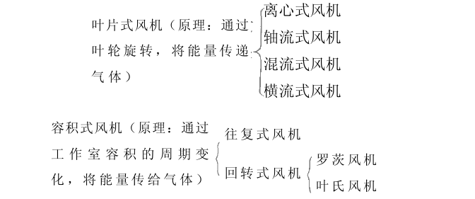而風(fēng)機呢,按工作原理不同,風(fēng)機可分為葉片式(又稱葉輪式或透平式)和容積式(又稱定排量式)兩大類,其進一步分類如下圖所示: