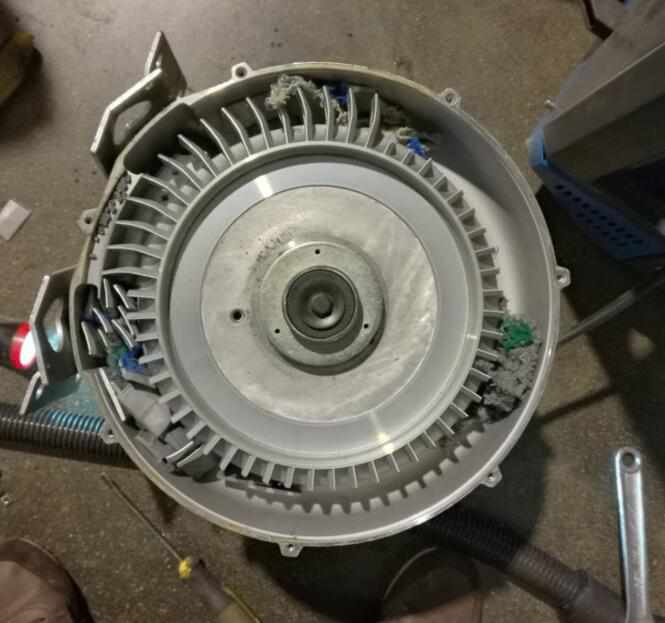 圖為損壞之后的葉輪,因進風(fēng)口吸進去雜物,導(dǎo)致四周的葉片被堅硬物打碎。所以一要定做好進風(fēng)口的防護工作。